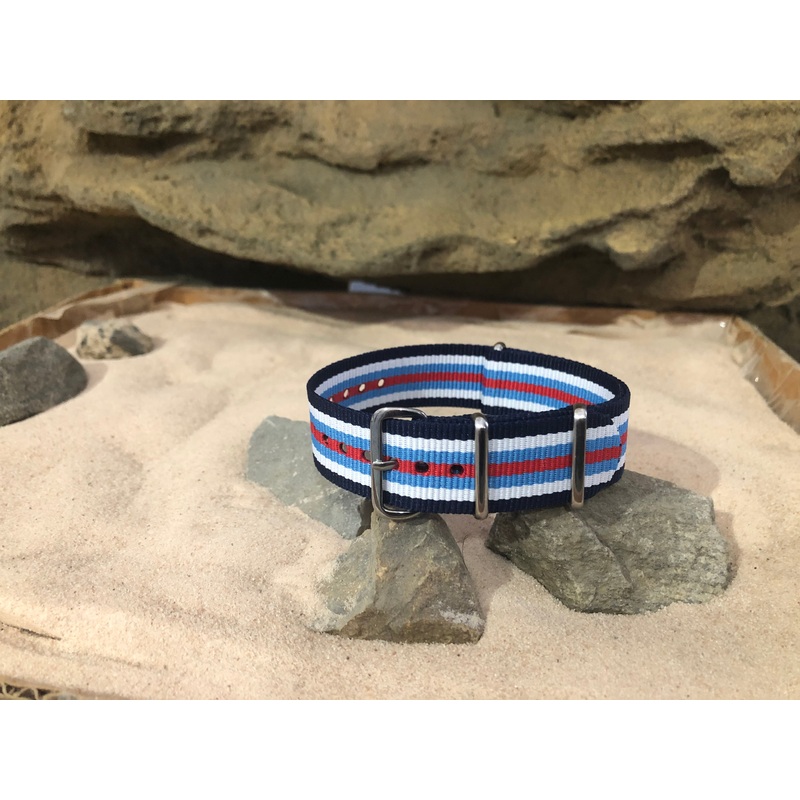 • The Sound. Navy, White, Light Blue and Red StripedBallistic Strap w/ Polished Hardware.