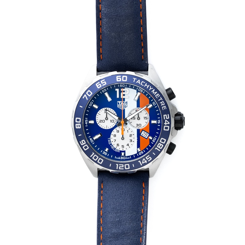 The dial is the standout feature, finished in Gulf blue with racing stripes. Orange and light blue accents echo Gulfs historic motorsport livery, instantly recognisable to collectors. Bold numerals at 12 and 6 sit alongside applied markers filled with Super-LumiNova. Hands are luminous too, ensuring the chronograph is legible day or night.