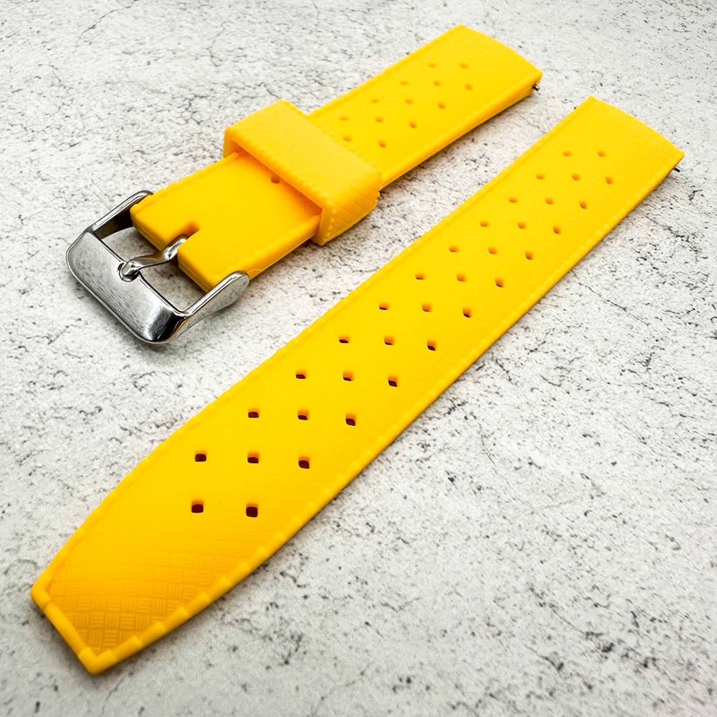 Classic. Legendary. Breathable. Dive into nostalgia with this vintage-inspiredyellow silicone Tropical watch strap, featuring a textured finish that exudes elegance. Prepare for exceptional comfort and a barely-there feel.
