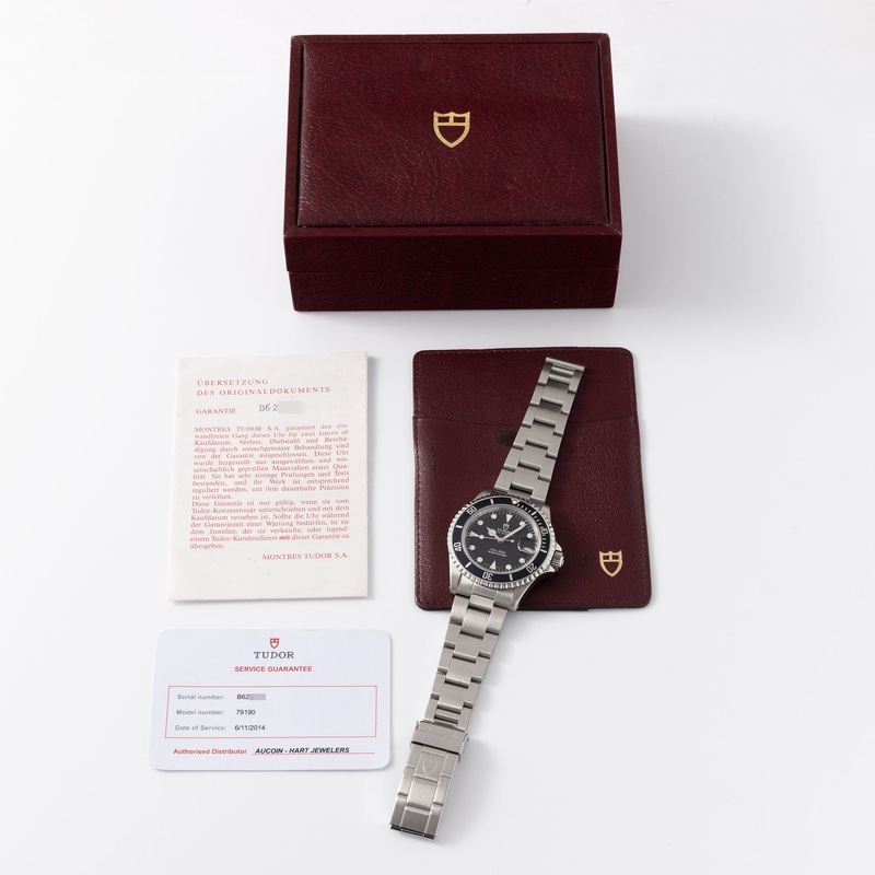 The watch comes with its Tudor inner box, a paper holder, booklet, and a Tudor service card from 2014.