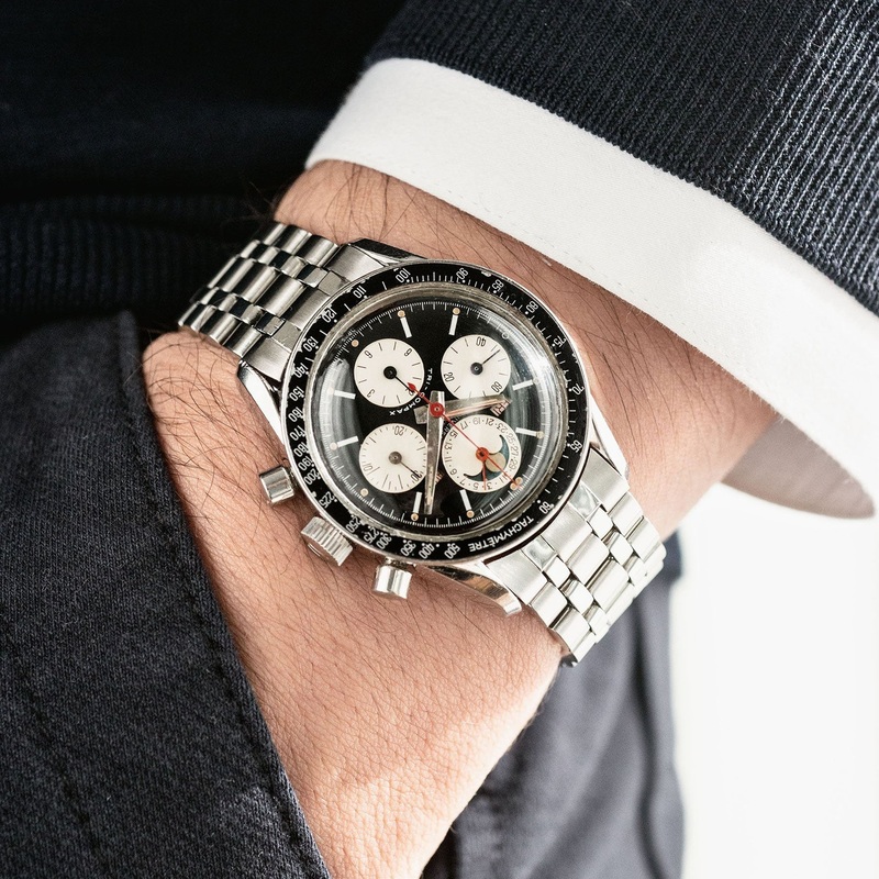 The Evil Clapton is the reverse panda version of the UG chronograph that Eric Clapton famously wore. This is a rare and desirable watch featuring a rare black SWISS T dial that remains in very good original condition. The Tri-Compax features (therefore called TRI compax!) three complications; triple-calendar, moon phase and chronograph.