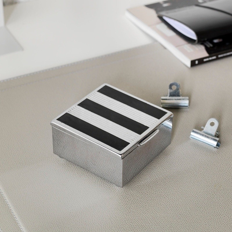 Unadorned original Art Deco style and everyday practical use come together in this vintage wooden box that is fully coated with chrome and carries a minimalistic grooved pattern on the lid. An absolute eyecatcher for any desk, it offers plenty of room for stationery, keys, a watch or whatever you want to throw in.