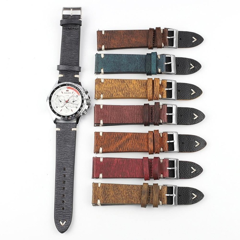 Vintage Faded Genuine Leather Watch Strap – This watch strap is made from genuine leather and features a vintage faded look. It is designed to fit any watch with a standard lug width of 18mm, 20mm, 22mm, or 24mm.