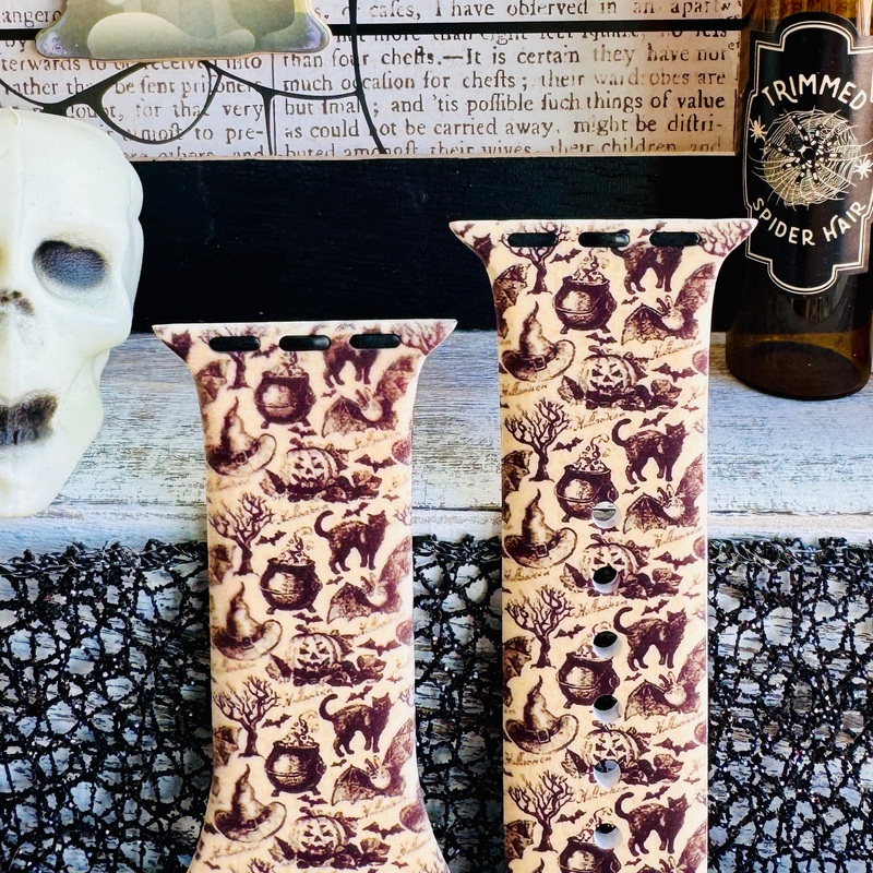 Old-soul spooky. Vintage Haunt wraps your wrist in an antique-parchment base printed with espresso-brown Halloween cameosthink black cats, witch hats, bats, and moons in a toile-style pattern. The soft-touch silicone feels light all day, rinses clean in seconds, and adds a subtle gothic twist to everyday outfitsfrom coffee runs to costume parties.