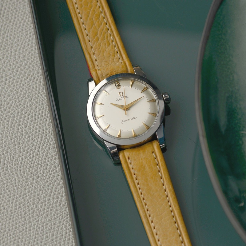 If you have ever wondered what a brand new watch would have looked and felt like in 1952, then we can help. We are offering what is essentially a brand new Omega Semaster dress watch from 1952 with all the accompanying documents in new condition. This reference 2577 features the 354 bumper automatic movement. The silver dial has a gold applied Omega logo, hour markers and hands. The watch has its original strap, Omega pin buckle, a paper hangtag and box stunning! We will also include an additional Bulang and Sons strap of your choice*. This watch is in completely untouched condition and we have decided to not even open this time capsule. The watch is running fine, but for everyday wear a service might be recommended! We are happy to assist with this if the buyer would prefer the watch to be serviced.