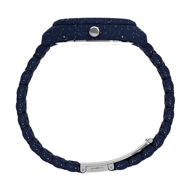 Were redesigning our past to take care of our future with the Waterbury Ocean collection. Featuring a case, bracelet, and dial crafted from upcycled, ocean-bound plastic, this remarkable wristwatch is the first Timex of its kind. Our partnership with #tide means its journey from waste to wrist begins with fishermen collecting plastic from the coastlines; the waste is washed and shredded before making its way to Switzerland via carbon-neutral transportation; and finally, its repurposed on-site, resulting in a premium, sustainable material. Waterbury Oceans dark blue, marine-inspired dial features unique flakes of shredded material, while the classic Waterbury construction itself honors our rich legacy in traditional watchmaking. Navigate uncharted waters ahead with all the trusted functionality youd expect from a Timexluminant hands and 30 meters of water resistanceand join us in working toward a cleaner tomorrow.