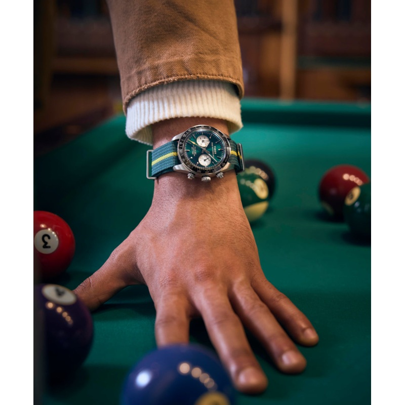 The Waterbury Heritage Chronograph combines modern functionality with timeless design, featuring a chronograph to track elapsed time and a black tachymeter bezel for determining average speed. Encased in a robust 39mm recycled stainless-steel case with vertical brushing, the green dial is accented by contrasting sub-dials and safeguarded by a double-curved and anti-reflective mineral glass crystal. Luminant hands ensure enhanced visibility, while applied indices and intricate detailing on the crown and pushers add a refined touch. Versatility is key, with a slip-thru strap design that makes it easy to switch out the double-layered fabric strap for one in another color, material, or style.