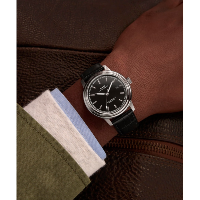 Defined by sharp lines and sweeping curves, the Waterbury Automatic features an enhanced 41mm stainless-steel case with an elegant two-tiered bezel. Encircling the black or silver-white dial are beveled markers and a rail track, paired with a sleek handset and a date window sitting beside the third hour marker. This sophisticated timepiece is paired with a black natural leather strap ethically sourced from the Leather Working Group (LWG), complete with an enticing crocodile grain and a deployant clasp.