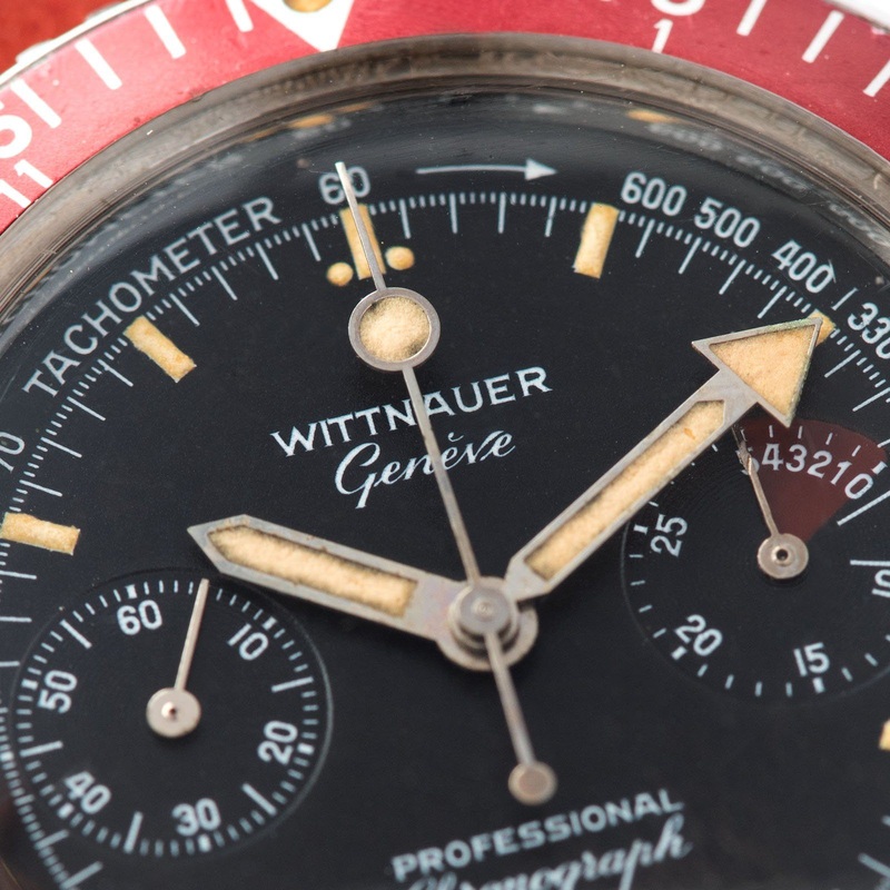 This is a great sized chrono with a funky twist in the red bezel. The 40mm steel case is in superb condition and the red rotating bezel can be used to measure elapsed time or could be used to monitor a second time zone. The black dial is in near perfect condition, with crisp white text that includes a tachymeter scale on the perimeter. Additionally, the minute counter has a red portion that is a five-minute countdown regatta timer how cool is that?! The lume hour markers have taken on a lovely rich patina that matches the hands nicely. And its the hands that are one of the standout elements of this cool watch. The cool big bubble centre-chrono hand and large arrow hour hand are fantastic! This super cool chrono comes with a Bulang and Sons strap. The 239T is driven by a Valjoux 7733 movement, which has been fully serviced by our watchmaker.