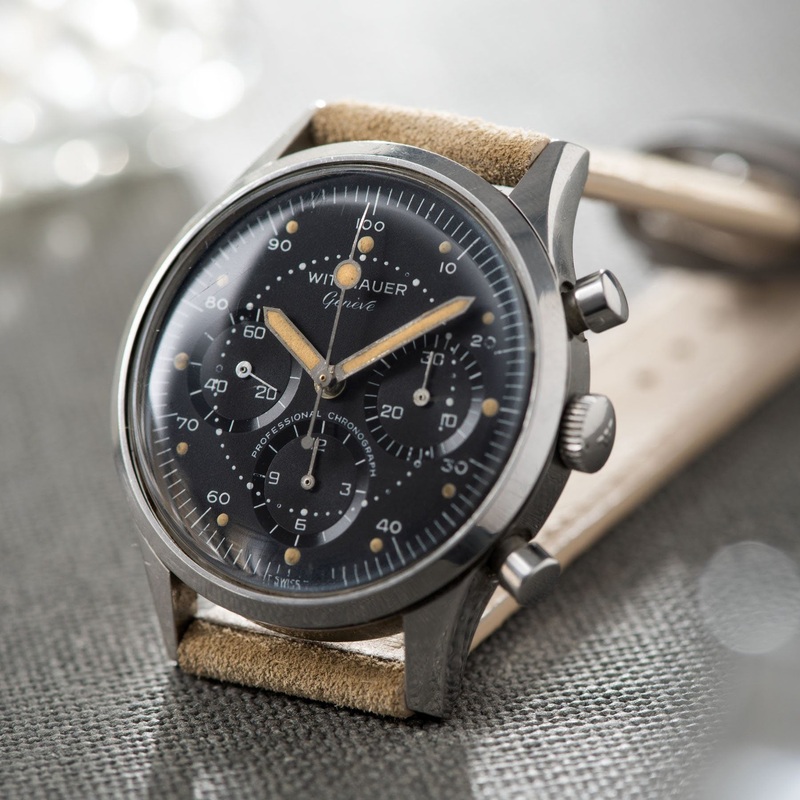 This is a very cool and unusual 40mm steel case in superb condition with a decimal scale on the outer edge of the dial. Essentially aimed at scientists, the scale can be used to accurately record percentages/units per hour. The matte black dial is in very good condition, with cool sunken registers. The lume hour markers have taken on a lovely rich patina that matches the hands nicely and the cool big bubble centre-chrono hand and arrow hour and minute hands are fantastic! The steel case is strong all round and features the original winding crown with W logo.
