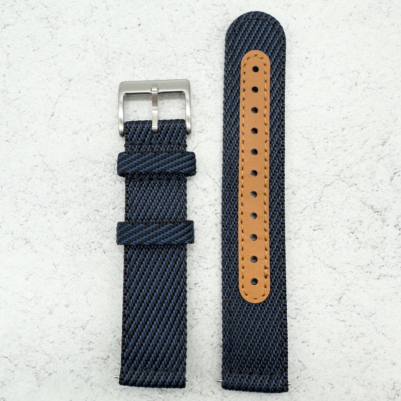 Sleek. Adaptable. Functional. This two-piece nylon strap in Blue offers the perfect balance of strength and style. With leather accents for added sophistication, its breathable design ensures a secure yet comfortable fit all day long.