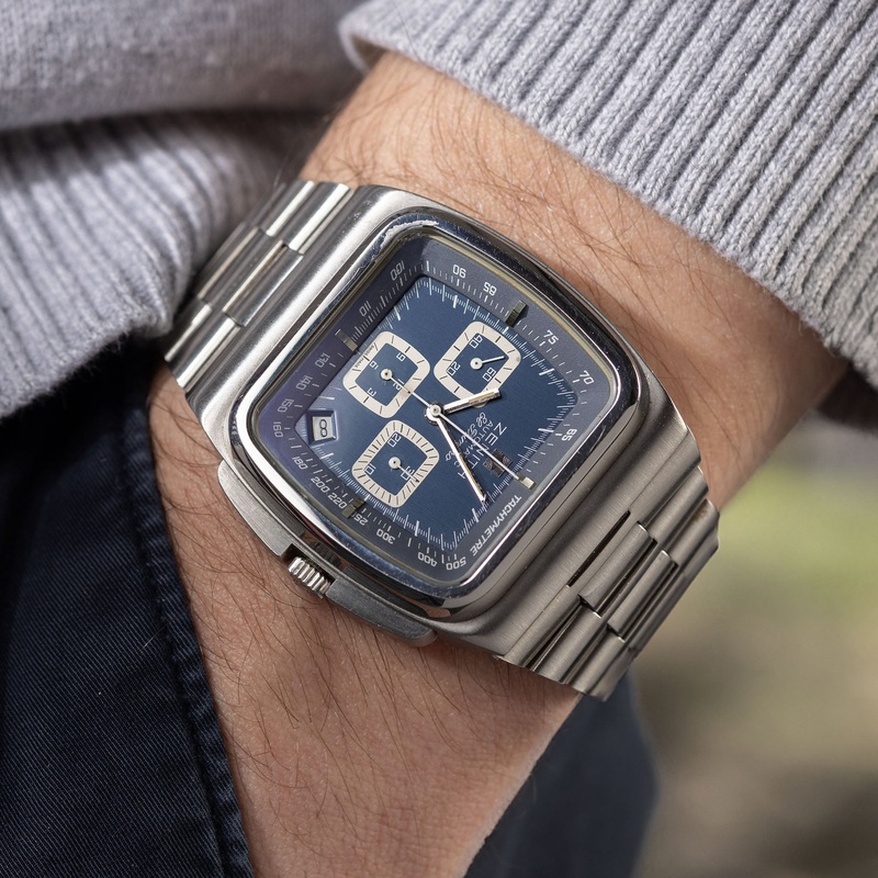 Introduced in 1969, the Zenith El Primero movement is renowned for its accuracy and quality, with this “Big Blue” version launching in 1972 featuring a distinctive 42mm case resembling a 1970s TV screen. This watch includes unique features such as long pushers that double as crown guards and a tachymeter inspired by Indy car racing. If youre looking for full-blown 70s vibes, this is the watch for you!