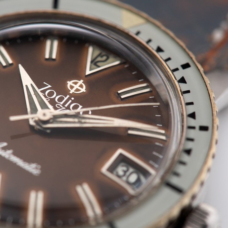 The Zodiac Seawolf is an iconic dive watch, launched at a similar time to the Rolex Submariner in 1953, it is enjoying a renaissance right now with vintage watch collectors. This Seawolf is particularly good looking, featuring a beautiful glossy gilt dial that has turned a tropical shade of brown! The dial features unusual hour markers at 12, 6 and 9 in the form of lume-filled triangles with arabic numerals in black. The dauphine hands are filled with lume that matches the hour markers. This look is complemented by a bakelite bezel that is ice blue. This vintage Zodiac is accompanied by its original warrantee papers, which remain blank. The watch has been fully serviced by our watchmaker.